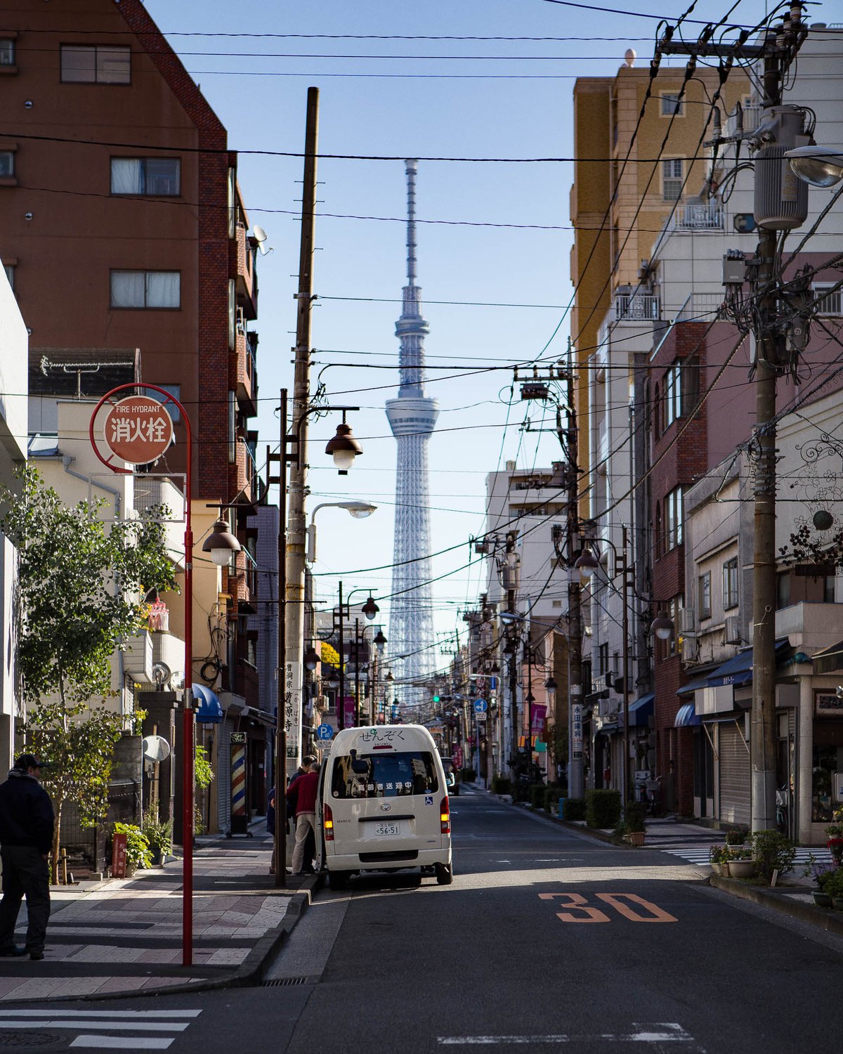 Фото снято в Токио в районе Асакуса. Здесь вы не увидите высоток и многополосных дорог с широкими тротуарами. Здесь на самом деле живут люди. Небо едва видно из-за проводов, вместо тротуаров - разметка на обочине. И только в просвете видно футуристичную башню Tokyo Skytree