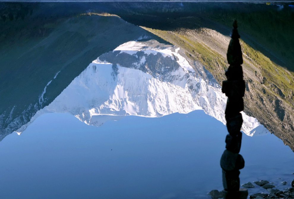 Балансирующие камни на фоне горы Белухи отражающейся в озере Аккем.