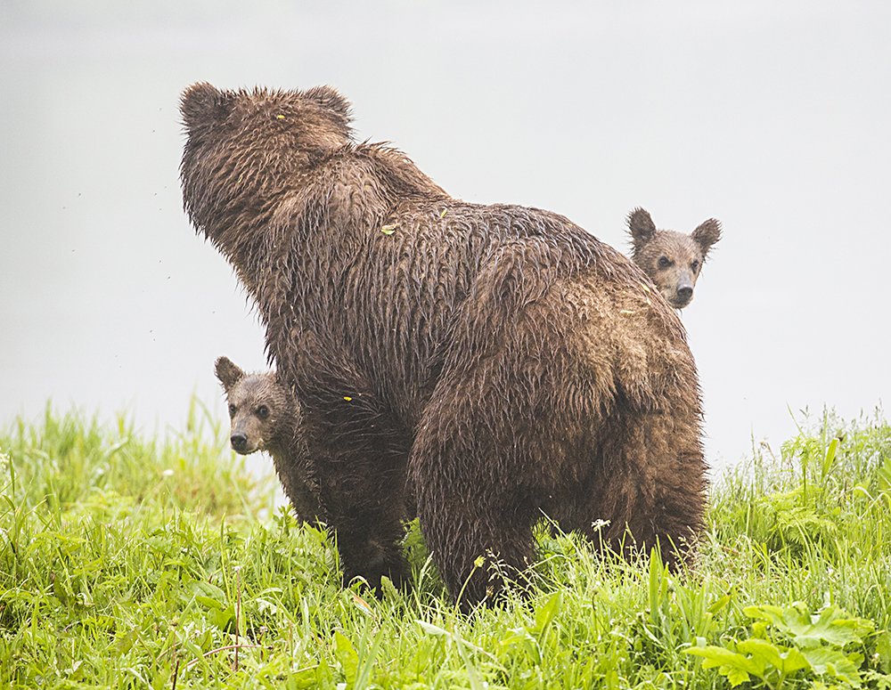 Кадр сделан на берегу Курильского озера. Сеголетки (медвежата первого года жизни) жадно изучают мир вокруг, но при этом стараются быть около мамы.
