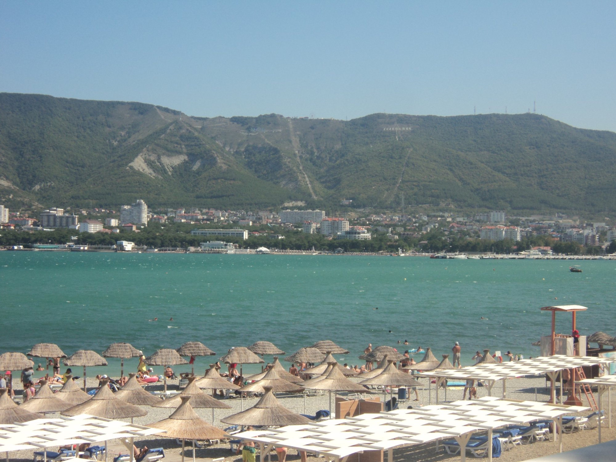 Вид на пляж и Геленджикскую бухту, а также на Маркотхский хребет.