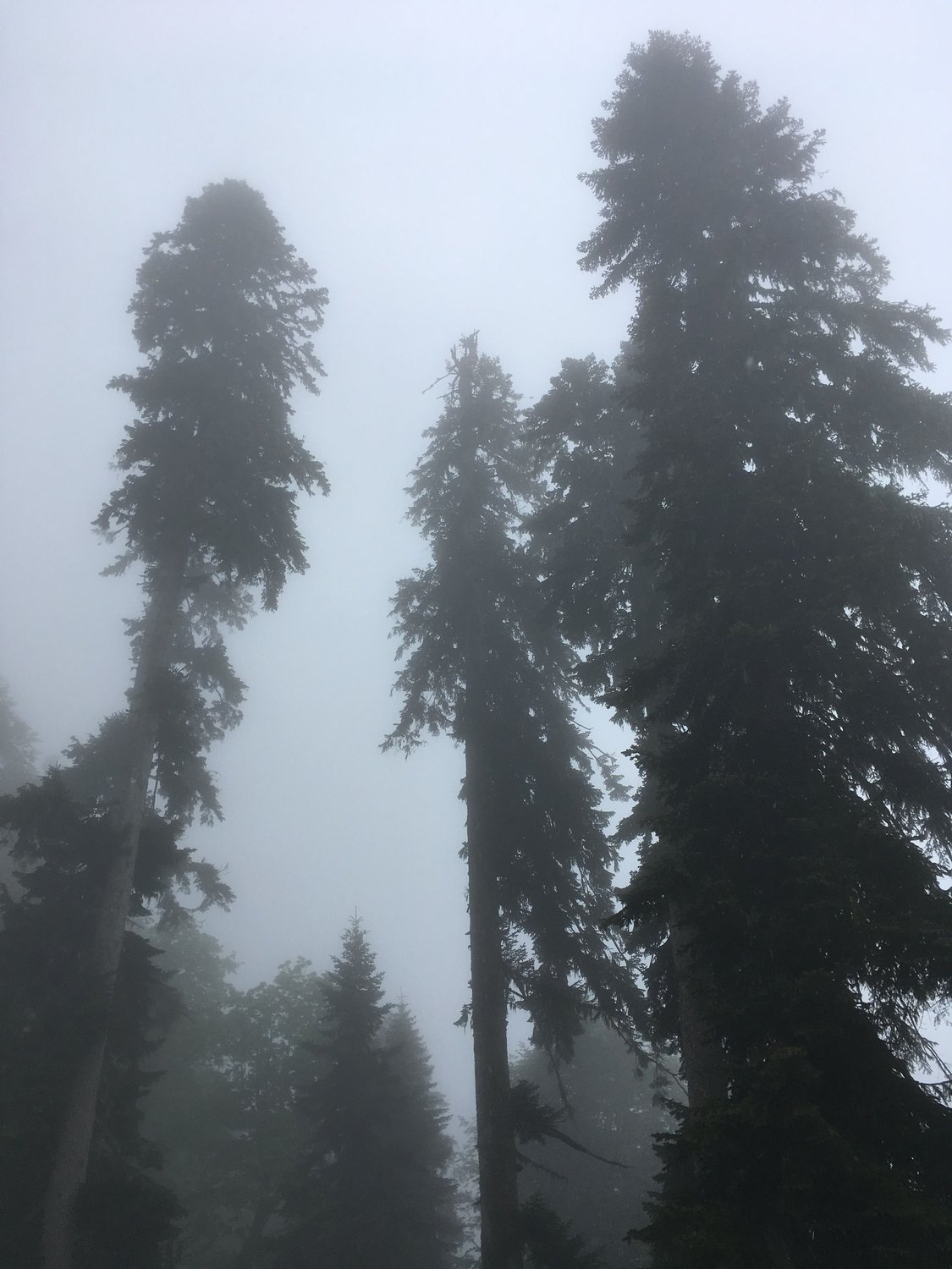 снимок сделан в Горах Сочи.величественные сосны возвышаются сквозь плотную облачную завесу. И исчезают в ней, словно призраки