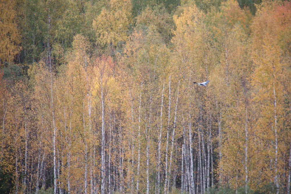 цапля летит на фоне осеннего леса
