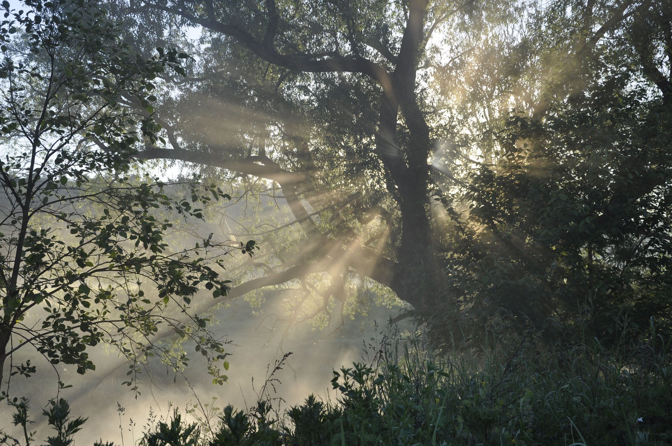 На берегу Истры ранним июньским утром свет пробивается сквозь деревья будто проливается ливнем. Солнечным ливнем.