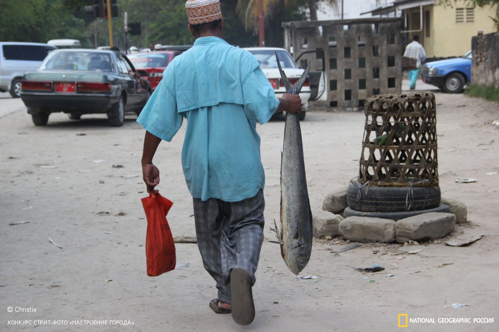 Рыбак несет свой улов на городской рынок. Вот такая рыба дорадо водится в водах Индийского океана. город Стоун Таун, остров Занзибар, октябрь 2011