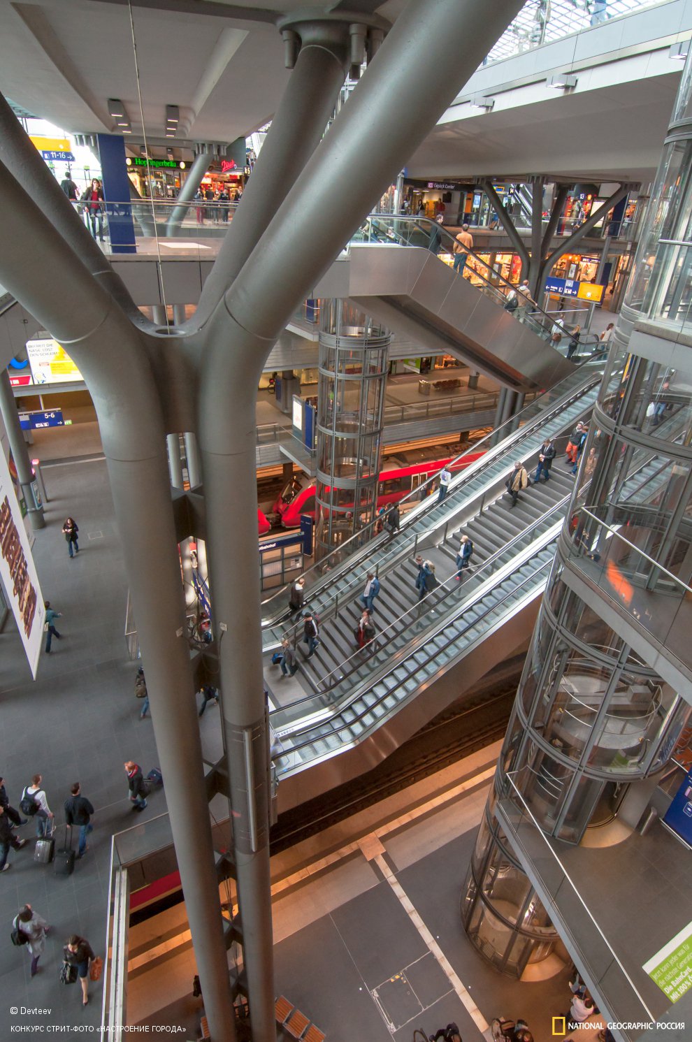 Многоуровенный главный вокзал Берлина, снятый с верхнего уровня широкоугольным объективом. Внизу проходят пассажиропотоки между региональными линиями (электричками) и метро. Фотография характеризует ритм большого города, где конструкция позволяет каждому пройти по собственной траектории.