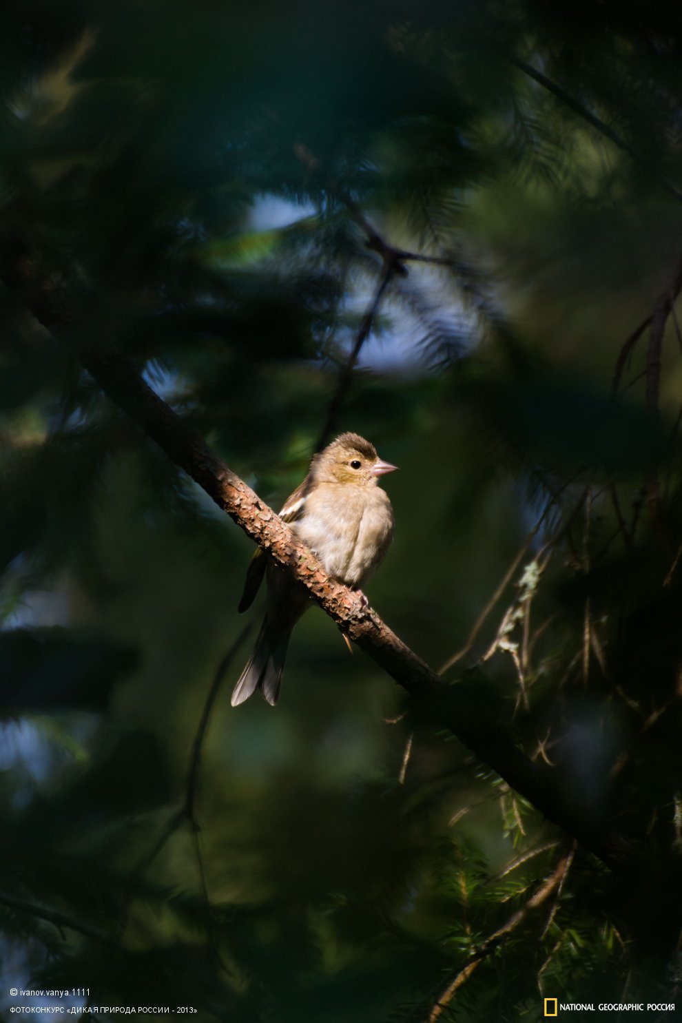 Подросший птенец сидит на ветке в глубине куста, освещенный лучами солнца, пробивающимися сквозь листву.