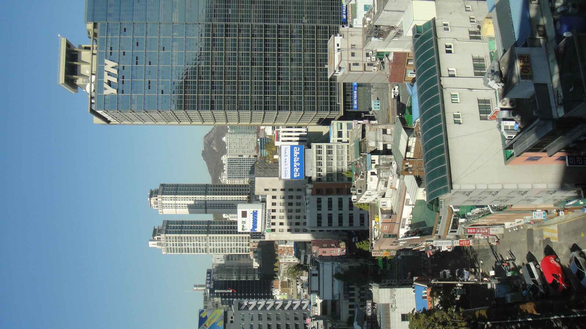 Утренние лучи отражаются в окнах как огромных офисных здании так и в традиционных для Кореи малоэтажных с зелеными крышами. Сквозь городские джунгли можно разглядеть вид на гору Пугаксан.