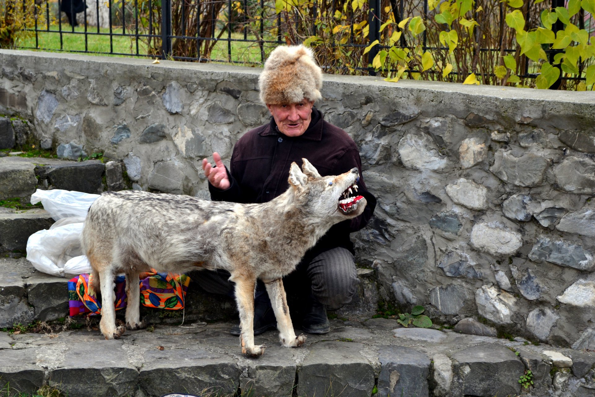 История, которую рассказывают про этого человека звучит так: местный житель из Шеки (Азербайджан) нашел в лесу одинокого волчонка и взял его к себе. Волк вырос и везде сопровождал своего хозяина, а потом от старости умер. Тогда Старик сделал из него чучело, и теперь ходит с ним ко дворцу шекинских ханов, предлагаю сфотографироваться за деньги.