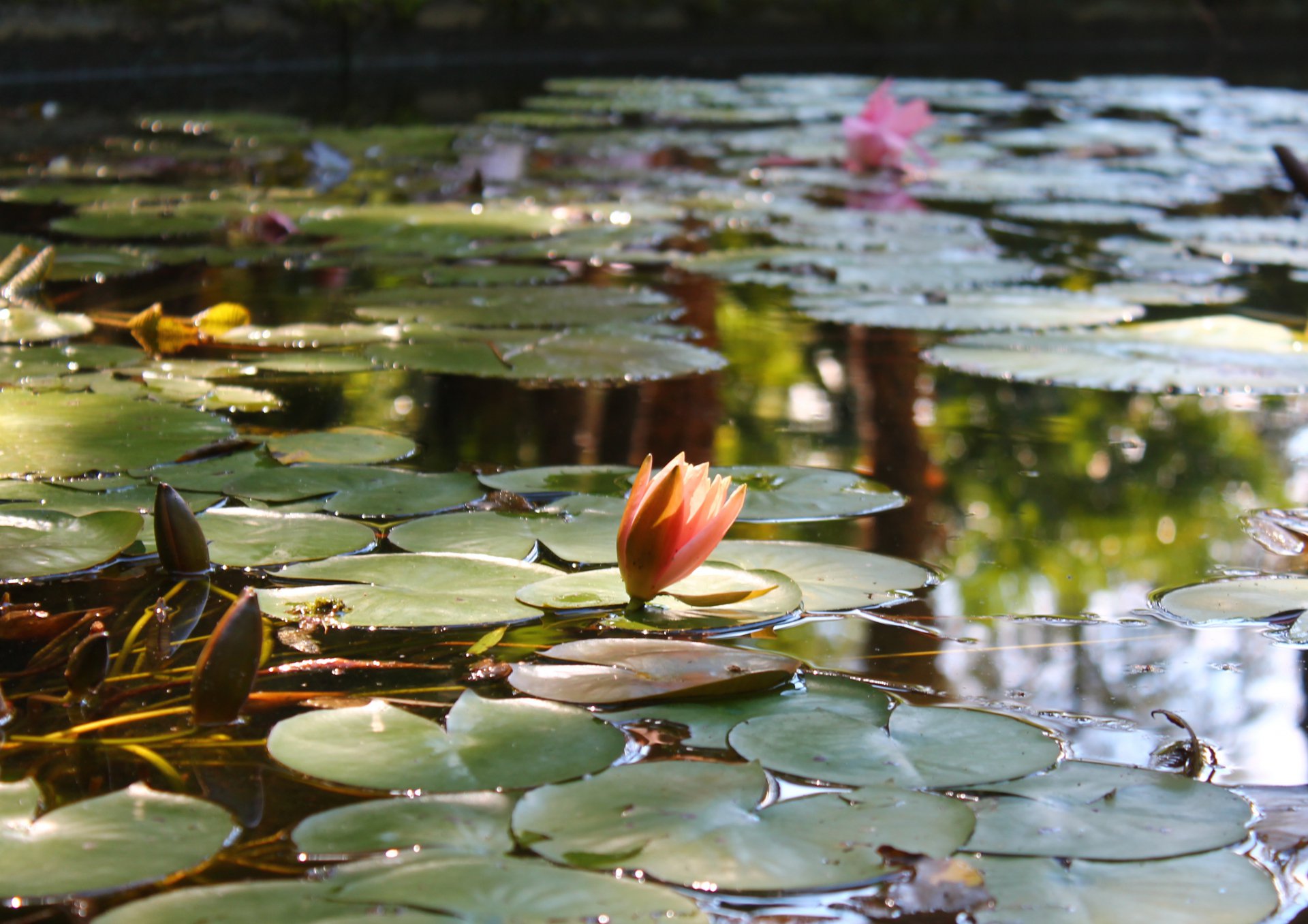 В ботаническом саду распускается кувшинка, ее лепестки в лучах солнца становятся по-особенному нежно-розовыми.