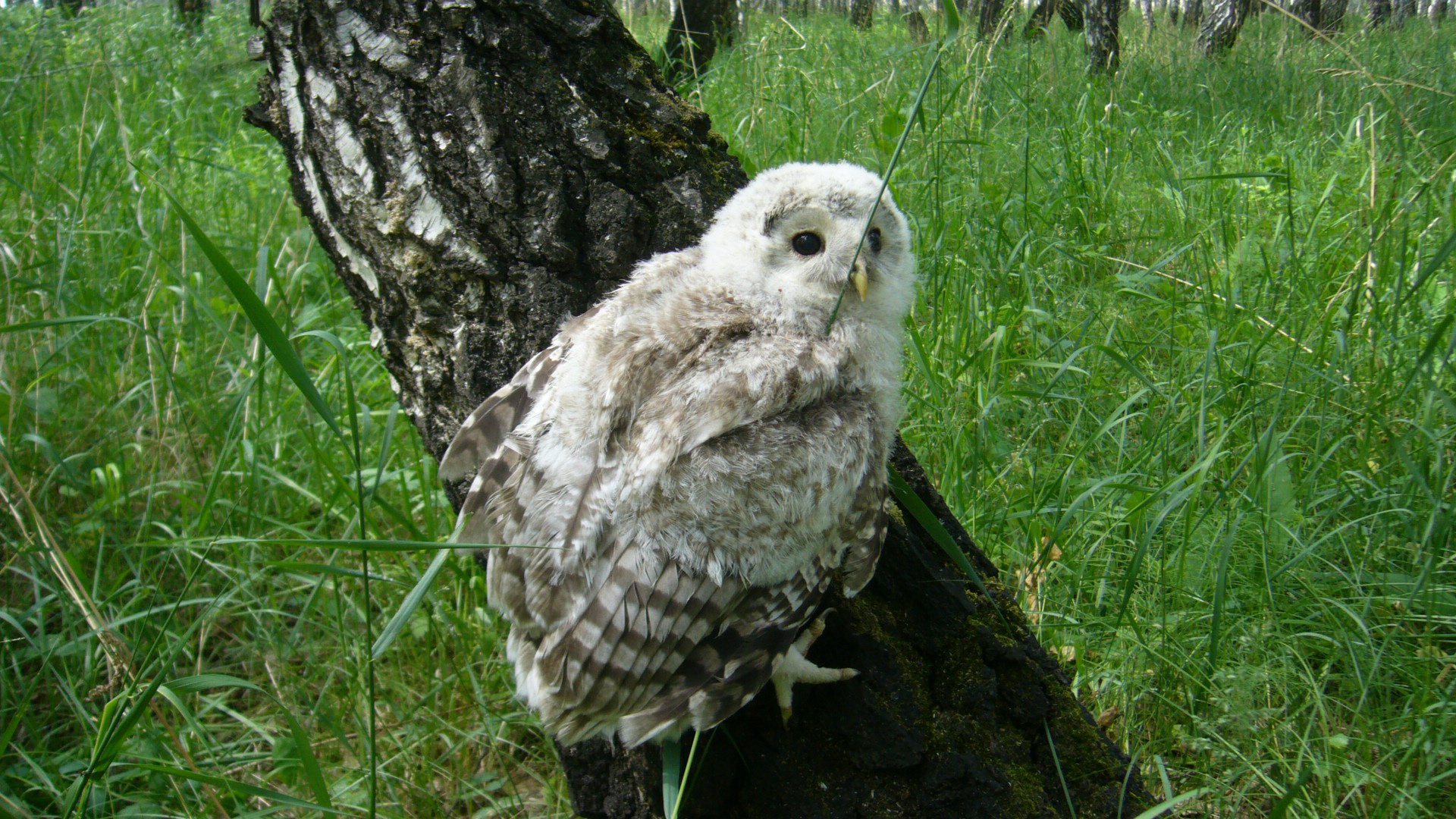 Молодой совёнок в березовой роще около села Криводановка, в Новосибирской области. Снимок сделан в июне 2012 года.
