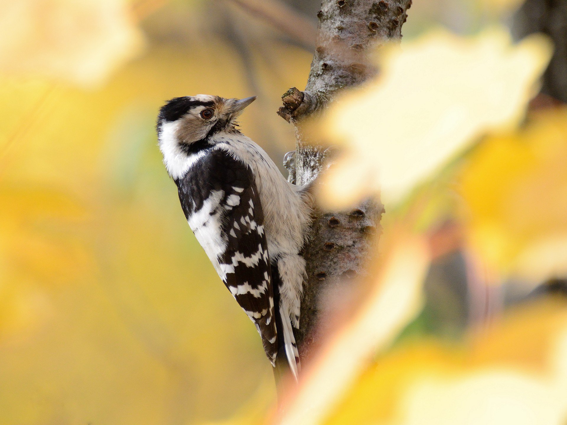Мы гуляли по осеннему солнечному лесу в окрестностях Ульяновска. Внимание обратил на себя малый дятел, обследовавший стволы и ветки деревьев. Он долго не давал себя сфотографировать, постоянно скрываясь среди ярких жёлтых листьев. Наконец мне удалось сквозь листву сделать несколько кадров – птица в красивом солнечном окружении.