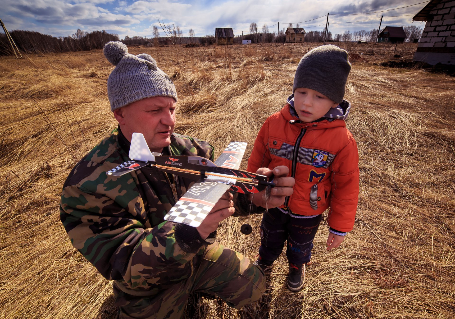 Мой дядя в детстве хотел быть летчиком. На фото он передает моему сыну секретную технологию закручивания резиночки в модельке самолета
