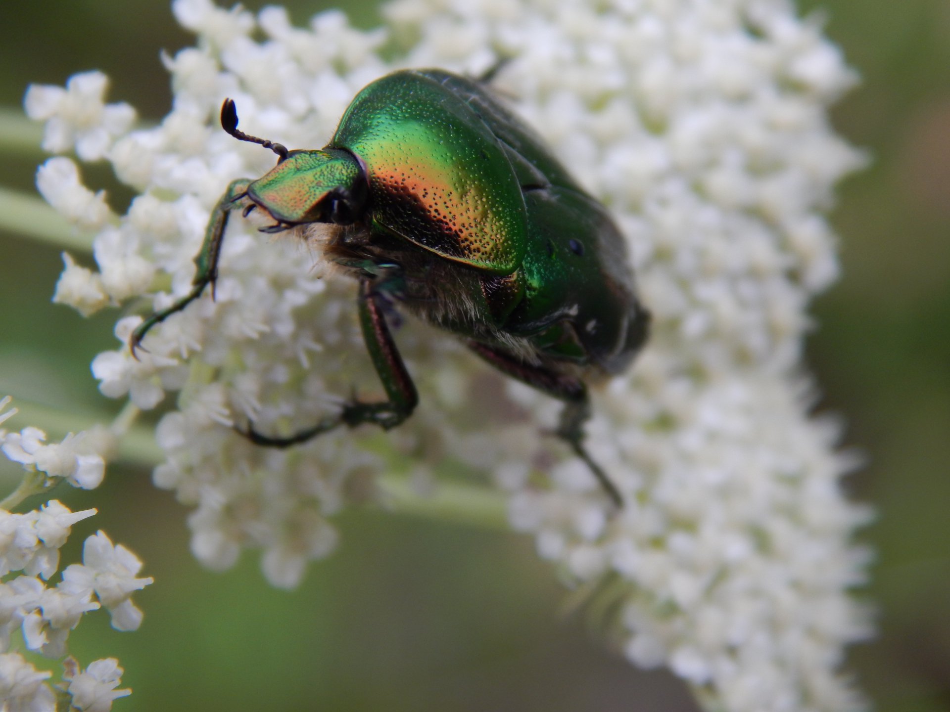 На цветущем барщевике сидит жук.