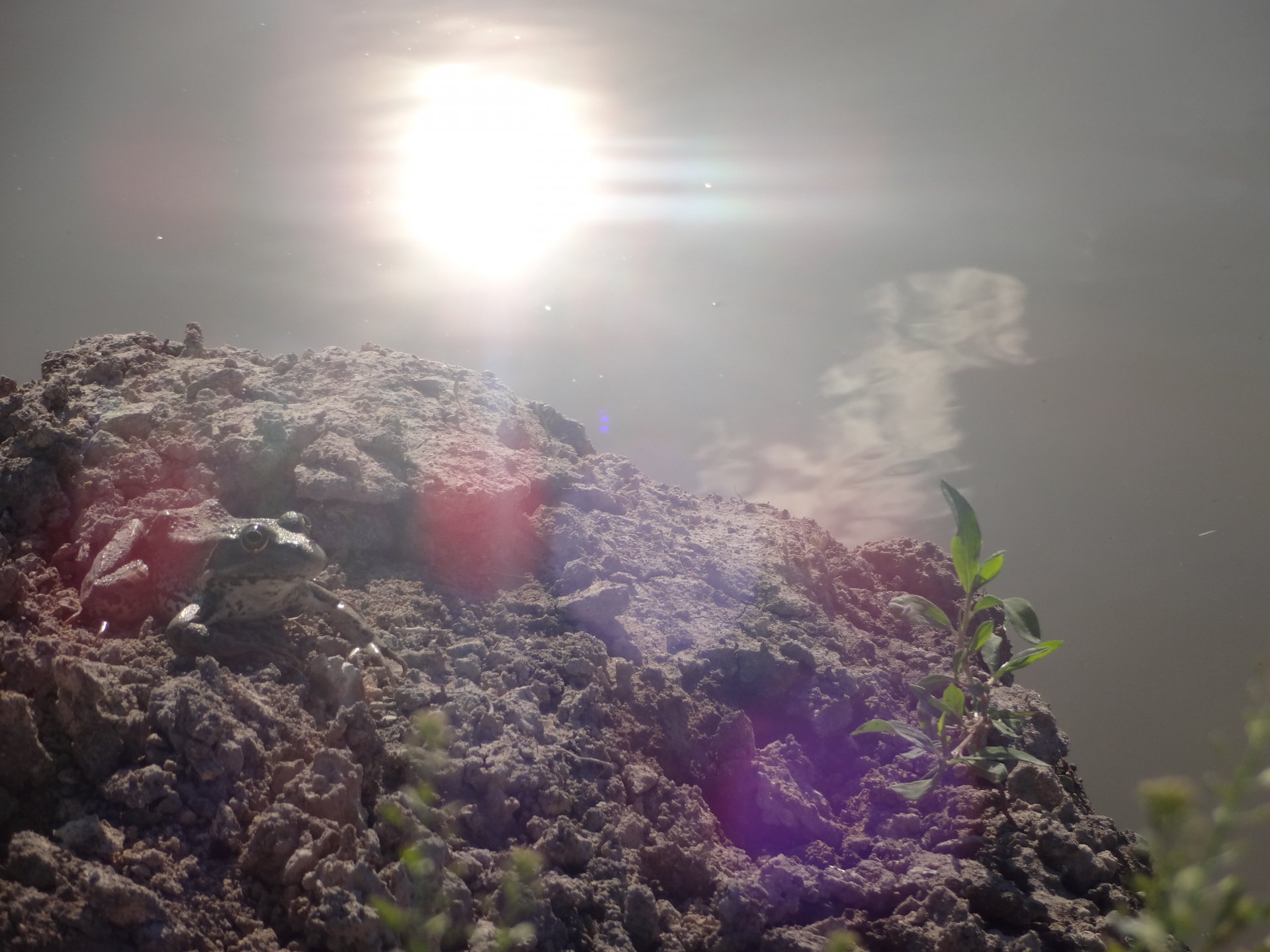 Лягушка греется на летнем солнце (никаких эффектов, Солнце отражается в воде)