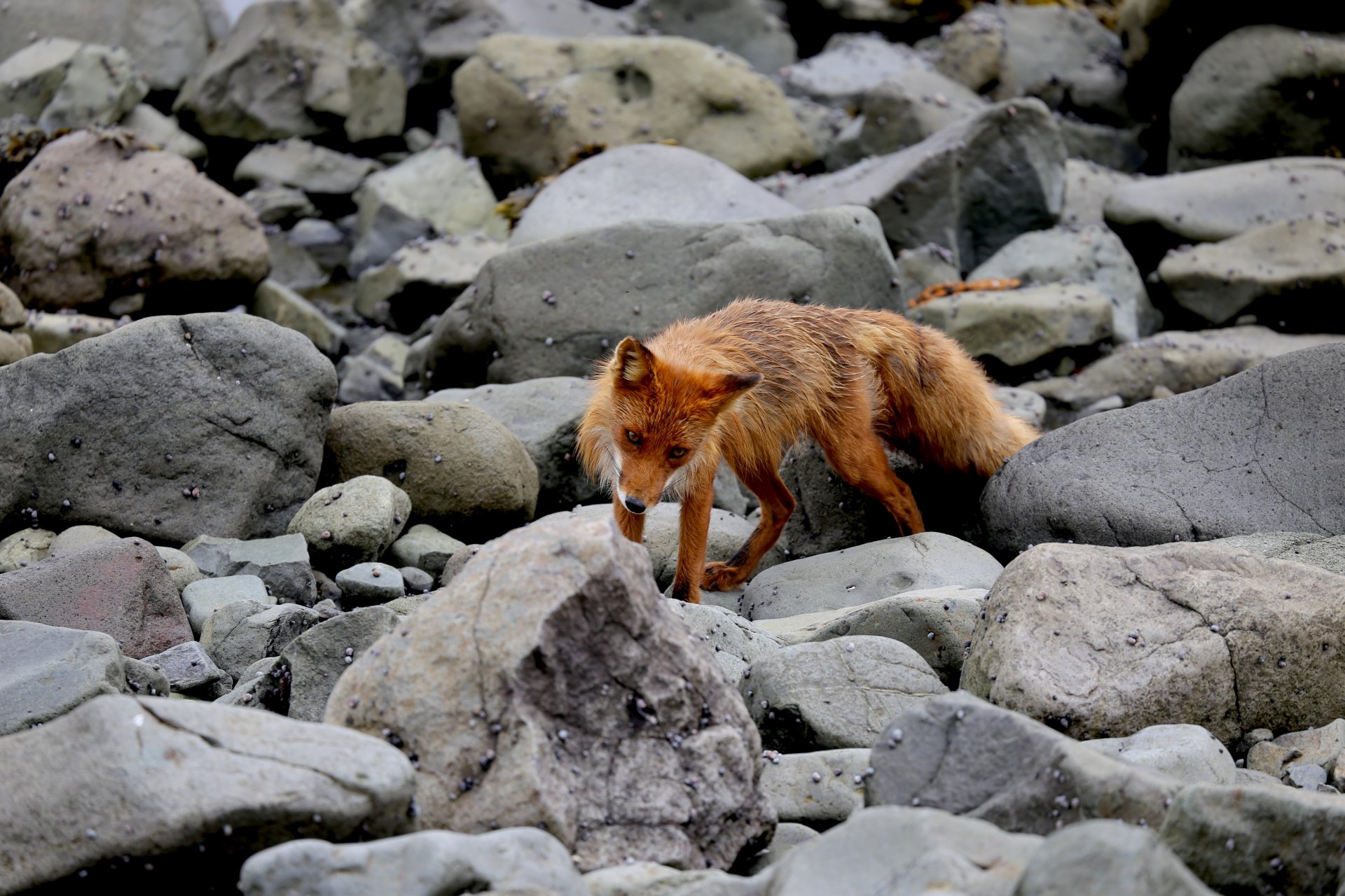 Лис ищет запрятанную еду на берегу о. Парамушир, Шелехово