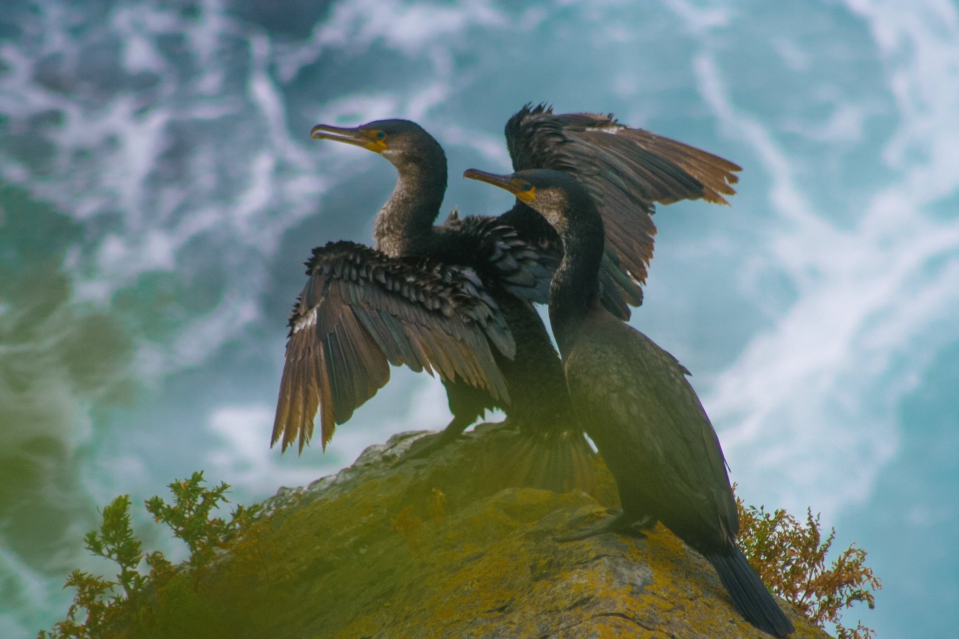 Пара бакланов была запечатлена в конце августа этого года в бухте Бойсмана (Хасанский район, Приморский край). Эти птицы очень любят посушить крылья на ветру подобным образом.