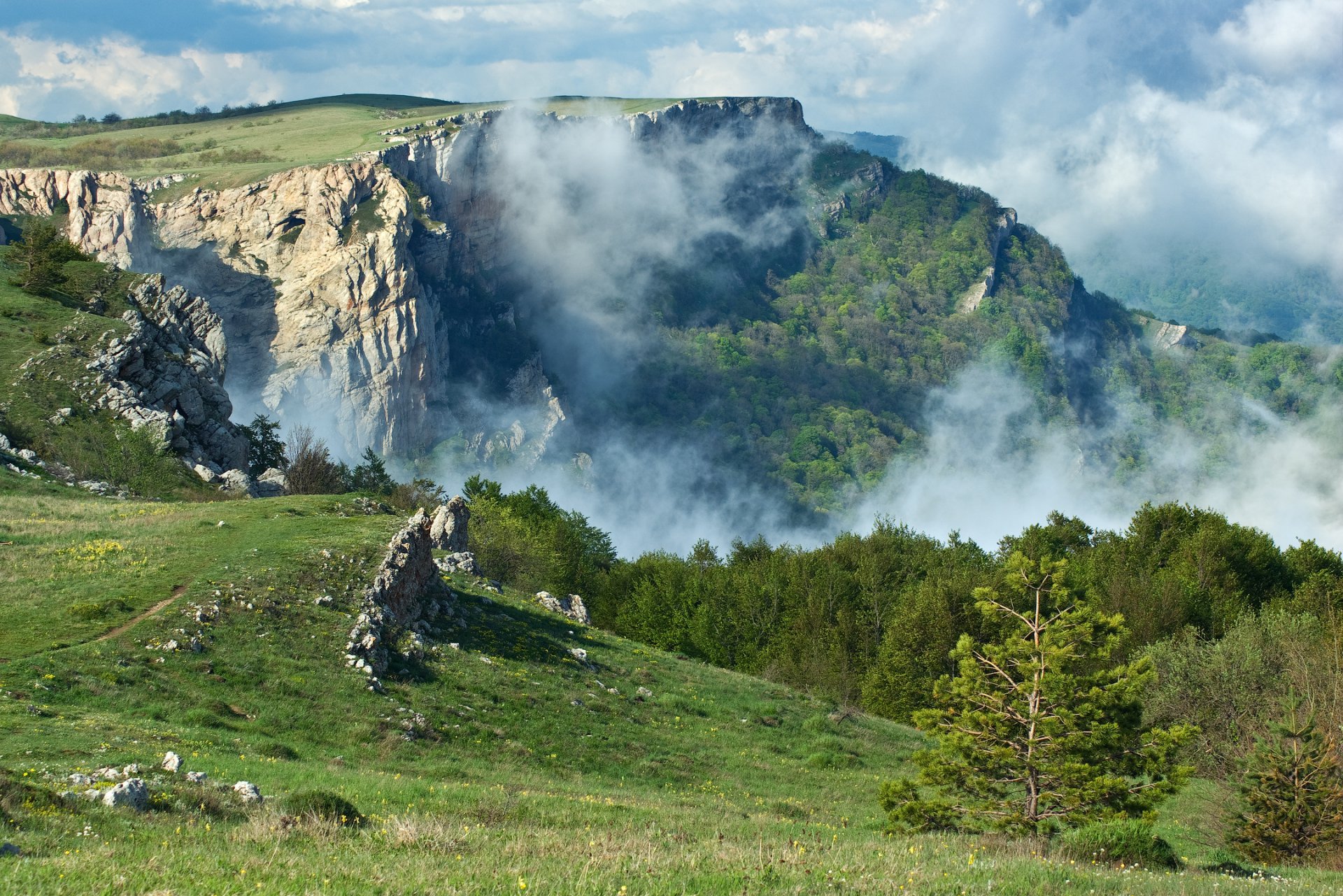 Вид перевала Караул-Оба между яйлами Северной Демерджи и Тырке на живописные скалы Хатмер-Кая, прикрытые вечерними облаками. Крым, Тырке-яйла, Стол-Гора. Май 2010 г.