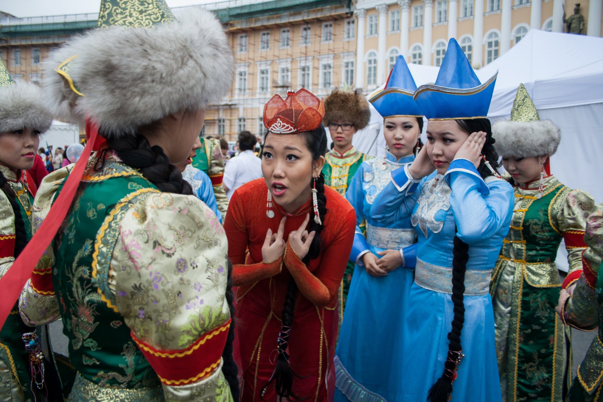 Бурятский ансамбль "Ая-ганга" готовится к выступлению на Дворцовой площади. Санкт-Петербург