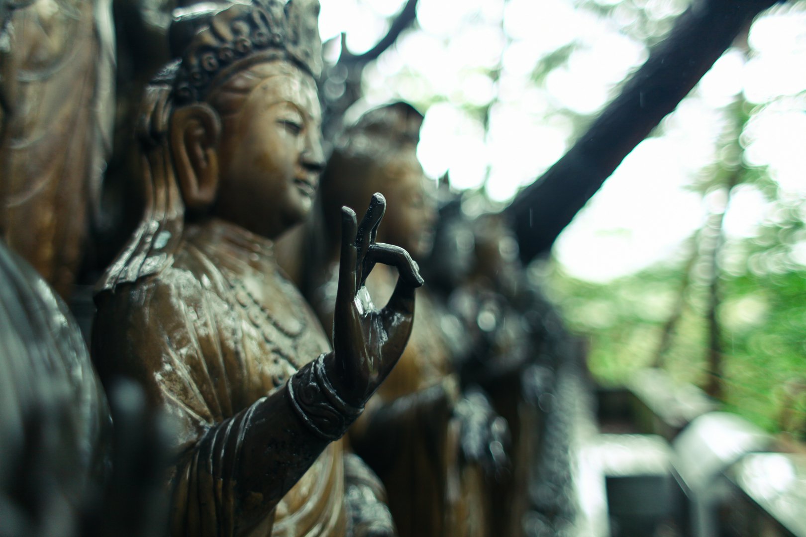 Многочисленные статуи Будды у входа в храм в национальном парке Пукхансан в Сеуле