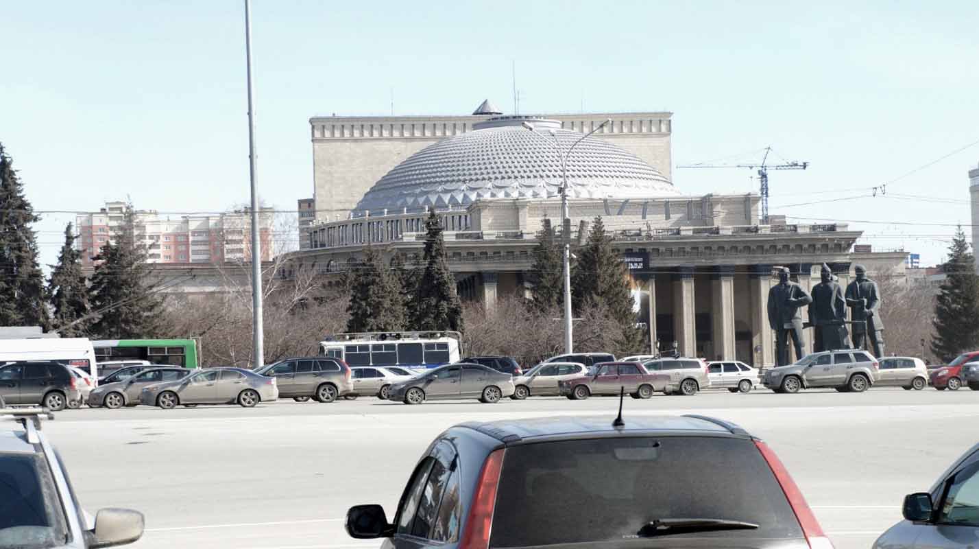 На заднем плане Новосибирский академический театр Оперы и Балета. Намного больше по размерам Большого театра в Москве