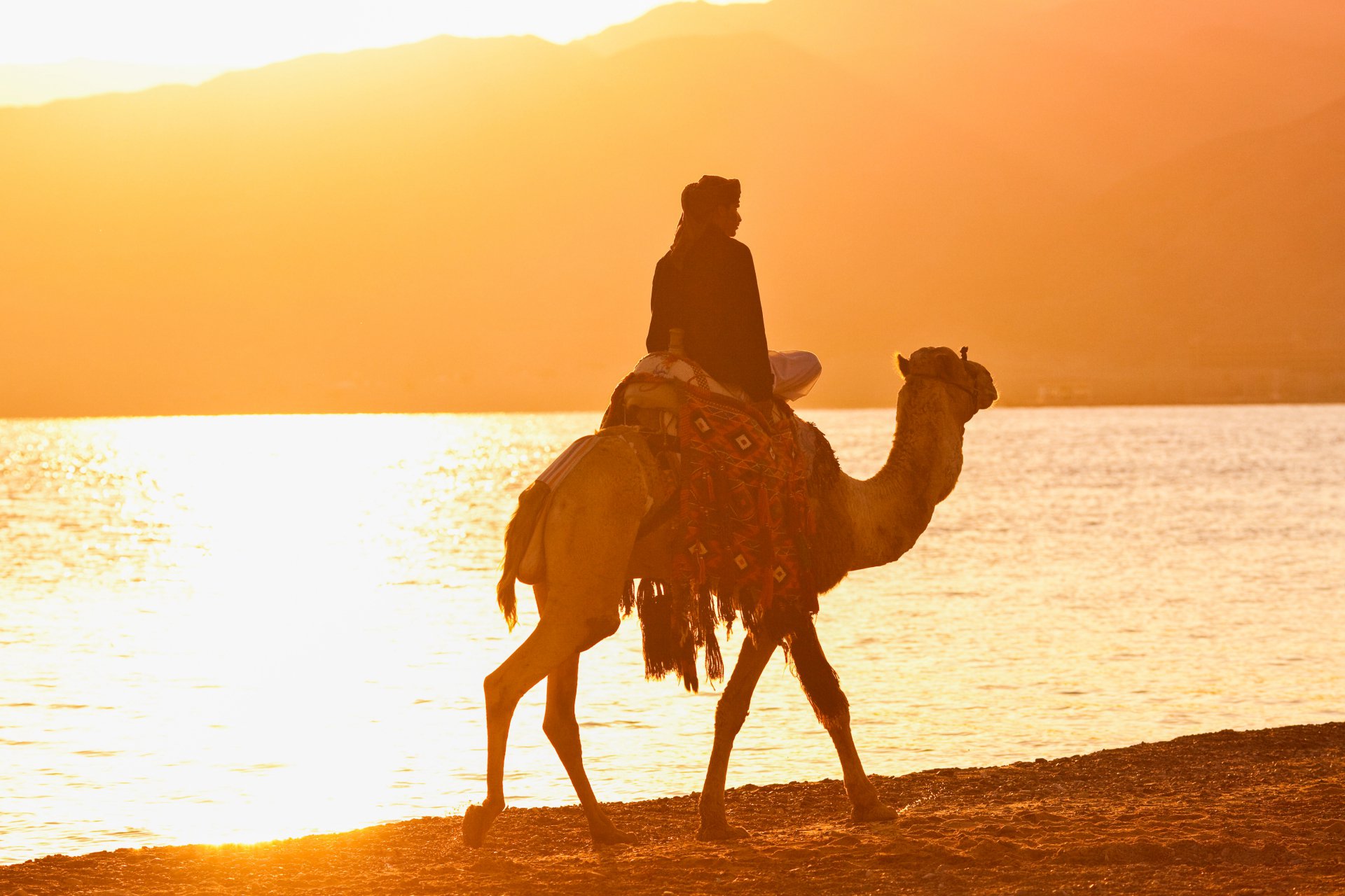 Наездник на верблюде неспешно идет вдоль моря в лучах заката.