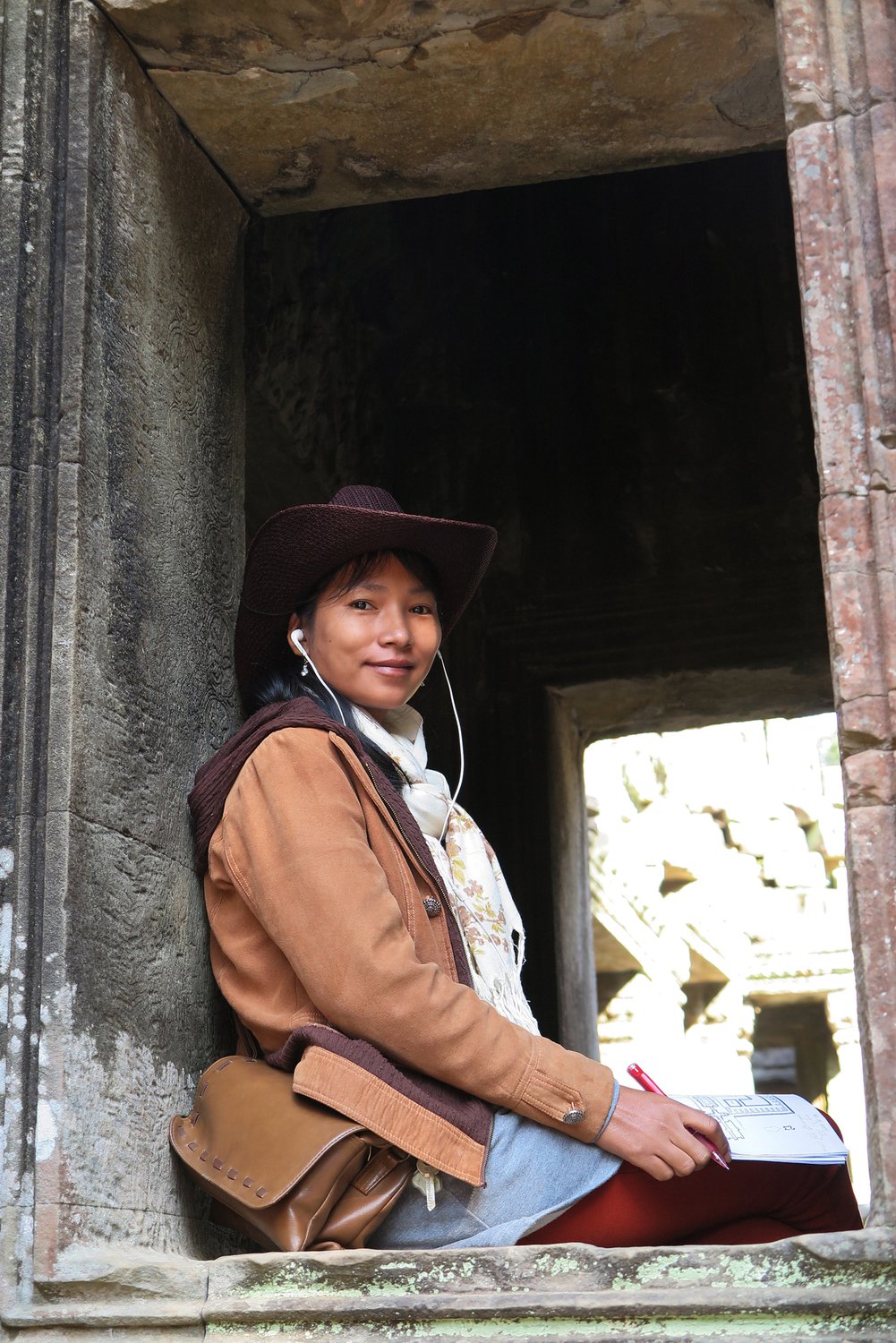 Юная жительница Камбоджи - студентка с интересом изучает древние исторические архитектурные памятники своей страны.