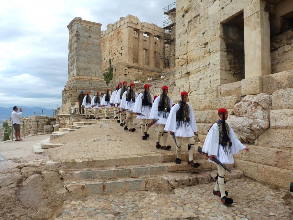 В Афинах почетный караул не только на площади.Каждый вечер отряд эвзонов всю ночь охраняет Парфенон,а в 8 утра под музыку покидает пост.