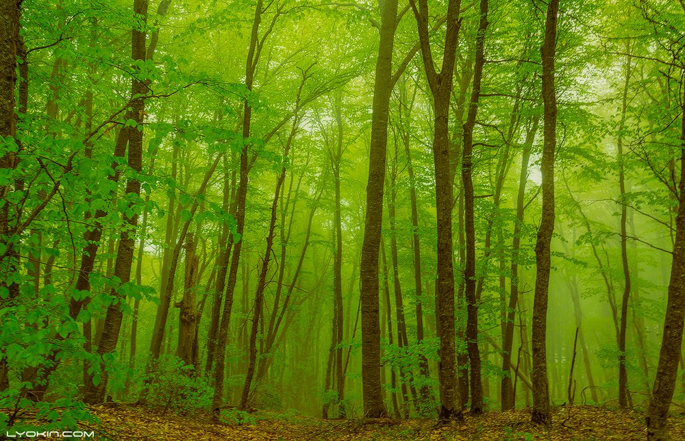 Легкий туман в майском лесу с яркими зелеными листьями очень приятное зрелище.
