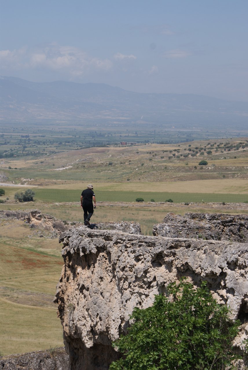 Смелый турист прогуливается по краю скалы. Высота значительная, ширина не более метра. Памукале, Турция.