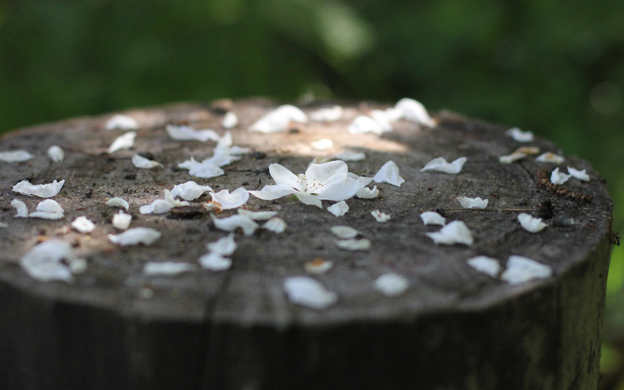 Опавший цветок яблони медленно приземлился на старый пенек. Северо-Запад России