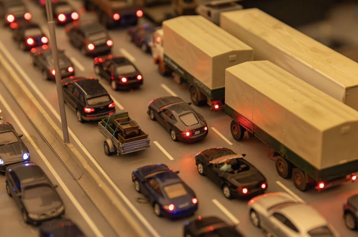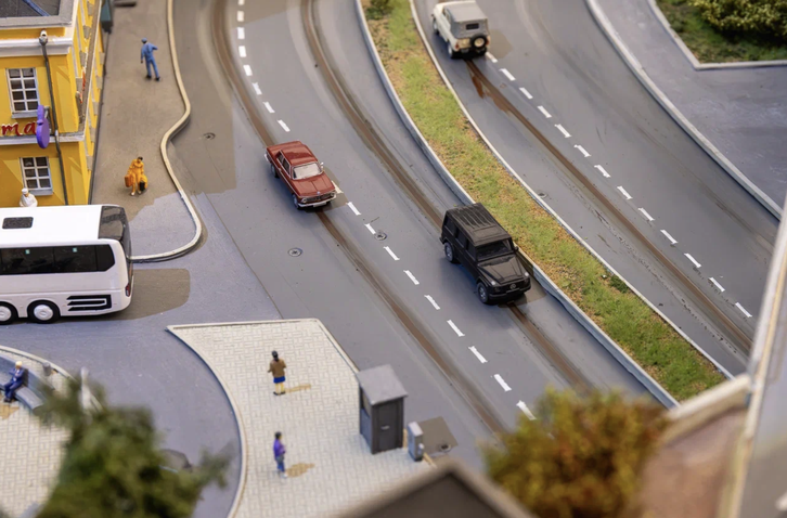 На макете 2,5 километров автомобильных дорог и 1,5 километра железных дорог, по которым курсируют «Сапсаны», «Ласточки», грузовые составы и более 1000 движущихся легковых машин, грузовиков и автобусов.