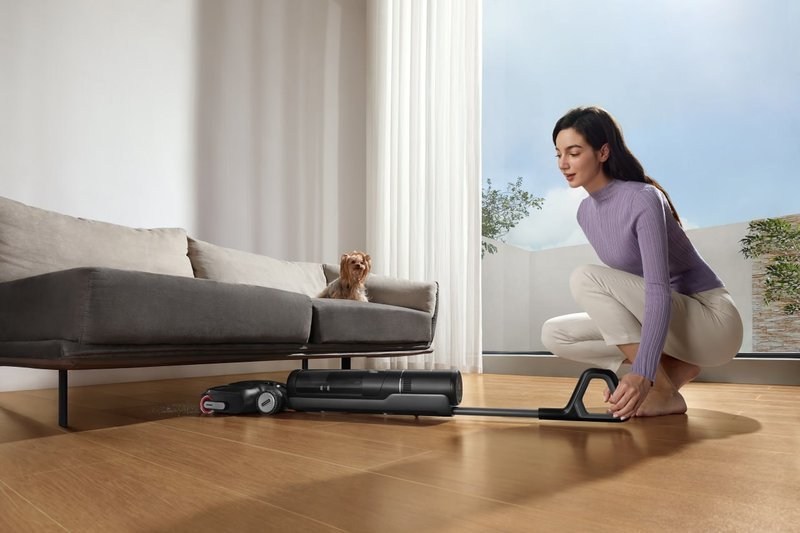 Технология TangleCut с эластичным скребком и лезвиями исключает наматывание волос и шерсти на валик, а алгоритм очистки на станции удаляет их в резервуар. Ёмкая батарея обеспечивает до 50 минут работы, покрывая до 300 м². Интеллектуальный режим автоматически регулирует мощность для экономии энергии.