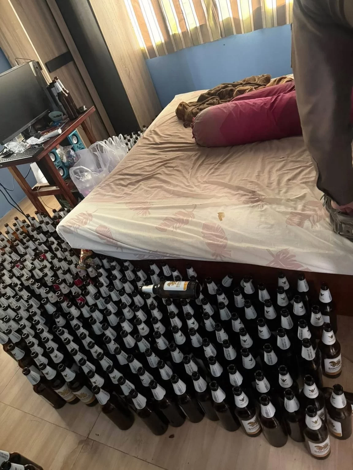Спасатели обнаружили в спальне погибшего более ста пустых бутылок. Их было так много, что они заполнили почти всю комнату, оставив лишь узкий проход к кровати. При этом пустые ёмкости были аккуратно выставлены в ряды.