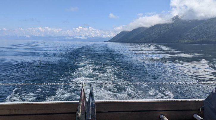 Потом мы отправились в бухту Змеиную, известную своими сероводородными источниками (+34…+42 °C). Вода там прозрачная и теплее, чем в остальном Байкале.