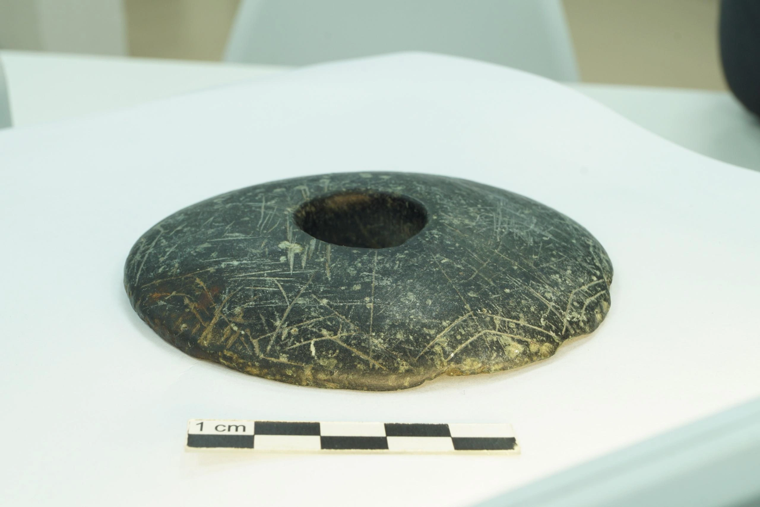 Необычный артефакт из мягкой породы камня имеет овальную форму: размеры диска составляют почти 10 сантиметров в ширину и 1,4 сантиметра в толщину. В центре предмета располагается отверстие диаметром около 3 сантиметров.