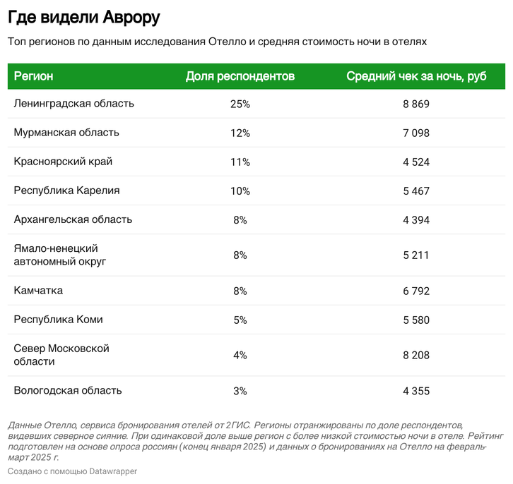 Дешевле всего во время путешествия за полярным чудом в феврале и марте 2025 года можно будет остановиться в Вологодской и Архангельской областях, а также в Красноярском крае, где средняя стоимость одной ночи составляет около 4.5 тысяч рублей. Дороже всего обойдется проживание в Ленинградской области, 8869 рублей.
