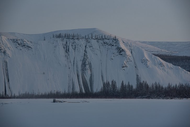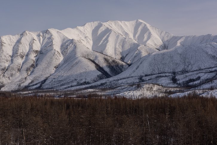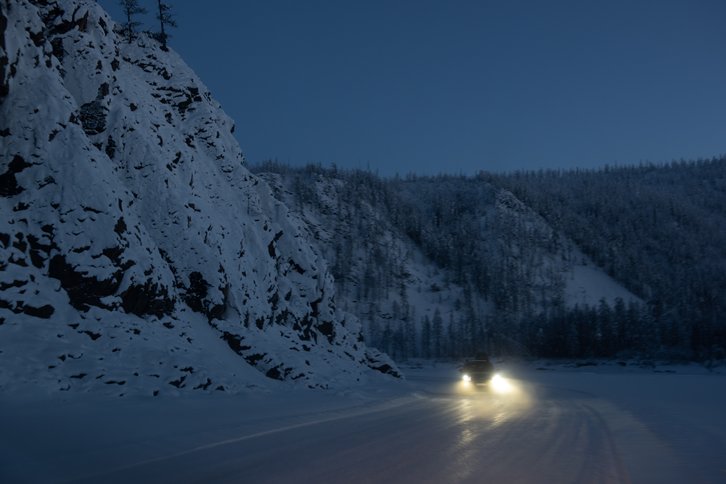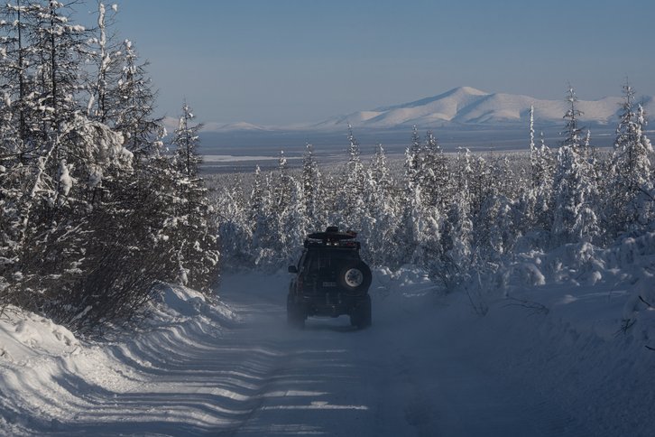Обстановка вокруг — горы, холмы, бесконечные снежные дали. День очень короткий, темнеет быстро, снег блестит в свете фар. Температура периодически опускается до -45 градусов, что для Якутии не очень-то и много. Забавно, что обычные термометры, в том числе, и те, что установлены в автомобилях, не показывает температуру ниже -40, поэтому нам пришлось закупиться в местном магазине другими.