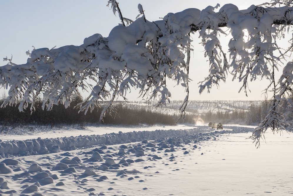 Что такое езда по зимнику? Иногда ощущения такие, словно едешь по стиральной доске — трясет непрерывно. Но периодически, когда попадаются хорошо очищенные грейдером участки, то можно разогнаться и до 100 километров в час. Впрочем, это бывает не так часто. Нередко мы ползли целый день со скоростью переполненного автобуса, проезжали где-то километров 200 часов за десять дороги. В этих местах нет привычных нам заправок, поэтому отдельно с нами ехал автомобиль с топливом.