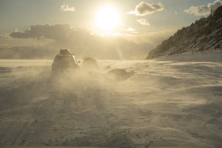 Ночевали же мы прямо в машинах, снимали задние сиденья, оборудовали себе лежанки и так и спали (в одежде и спальниках, конечно). Завтракали, обедали и ужинали тут же — в автомобилях, еду разогревали в бардачках с подогревом. Но все эти сложности, безусловно, того стоили. Перед нами открывались невероятные виды зимней нетронутой природы!
