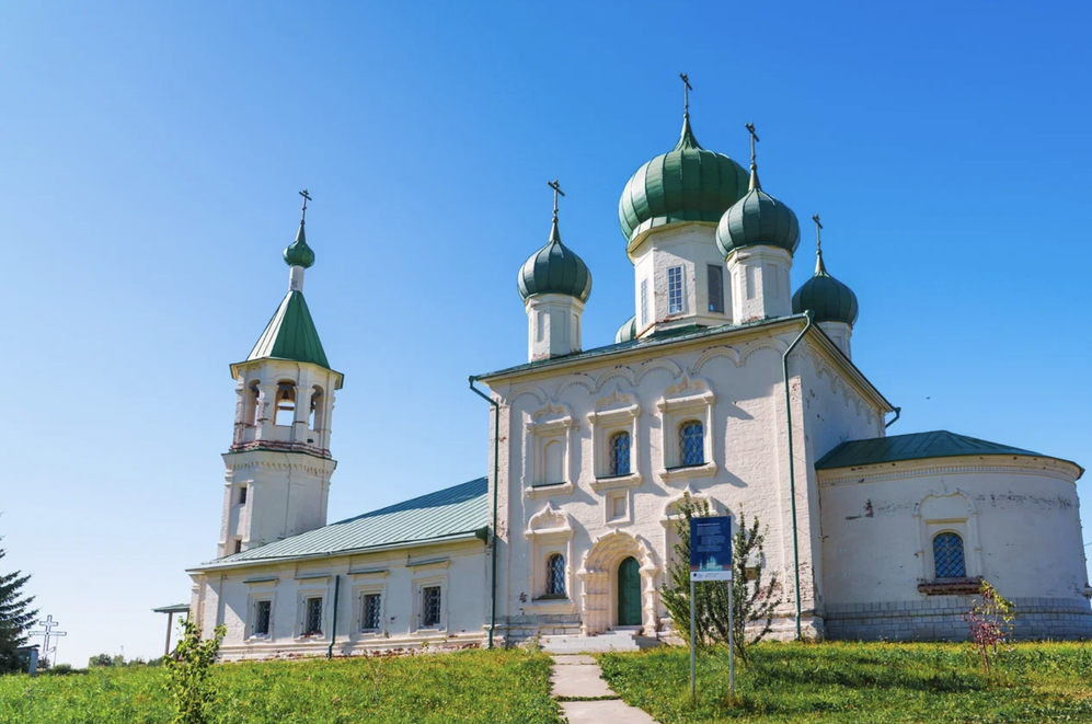 Необычный деревянный храм с шатровой крышей ажурной резьбой на берегу реки Пежма был построен в конце 2010-х: здесь много примет XXI века вроде колоколов с пультом ДУ и источника на фотоэлементе. Но потолочные росписи, хотя и кажутся современными, на самом деле точно повторяют фрески из стоящей рядом полуразрушенной Воскресенской церкви.