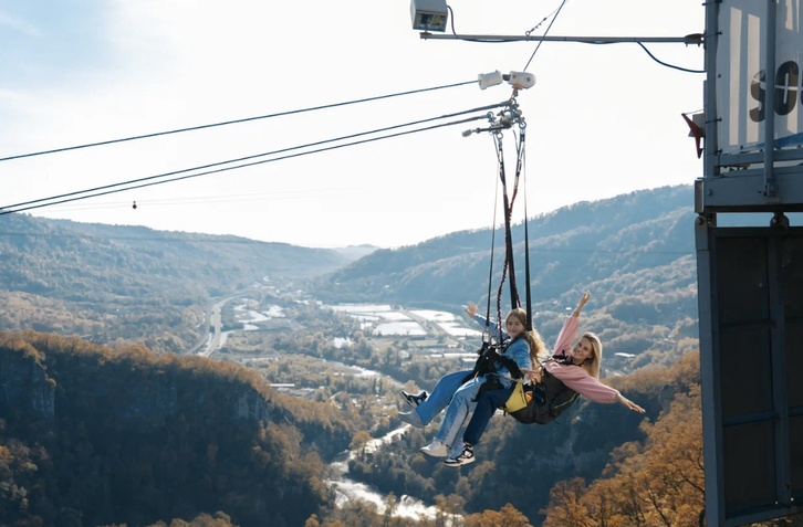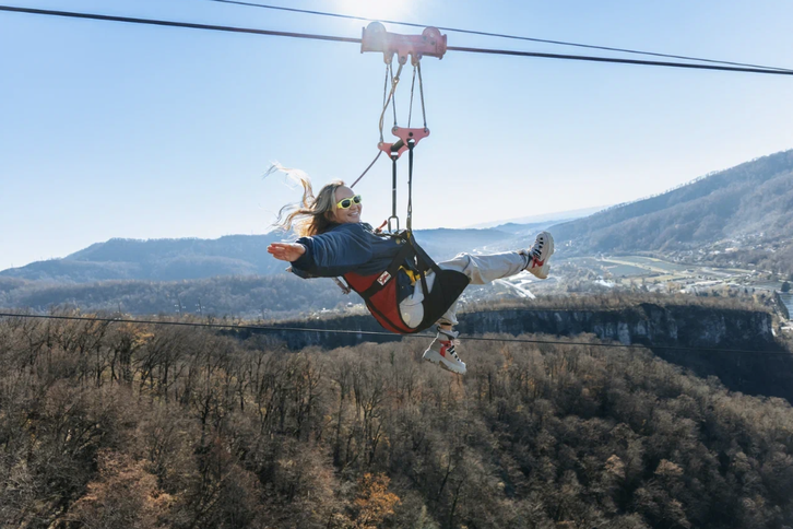 Если прыжок в пропасть кажется слишком экстремальным, можно выбрать полет на троллее. Zipline позволяет не слишком быстро скользить над ущельем на скорости 60 км/ч, наслаждаясь видами. Это одна из немногих возможностей полетать в парке с детьми: у аттракциона нет нижней границы возраста, лишь ростовые и весовые технические ограничения.