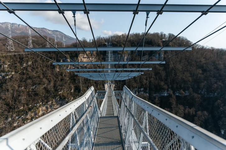 Первым делом отправляйтесь на самый длинный в России (и один из самых эффектных в мире, по нашему мнению) подвесной пешеходный мост, парящий между двумя склонами ущелья. Его длина – 439 метров — и впечатляющую конструкцию можно заметить ещё с дороги. С высоты 207 метров открываются захватывающие дух панорамы Кавказских гор и колхидских лесов, которые зимой выглядят особенно контрастно и ярко.