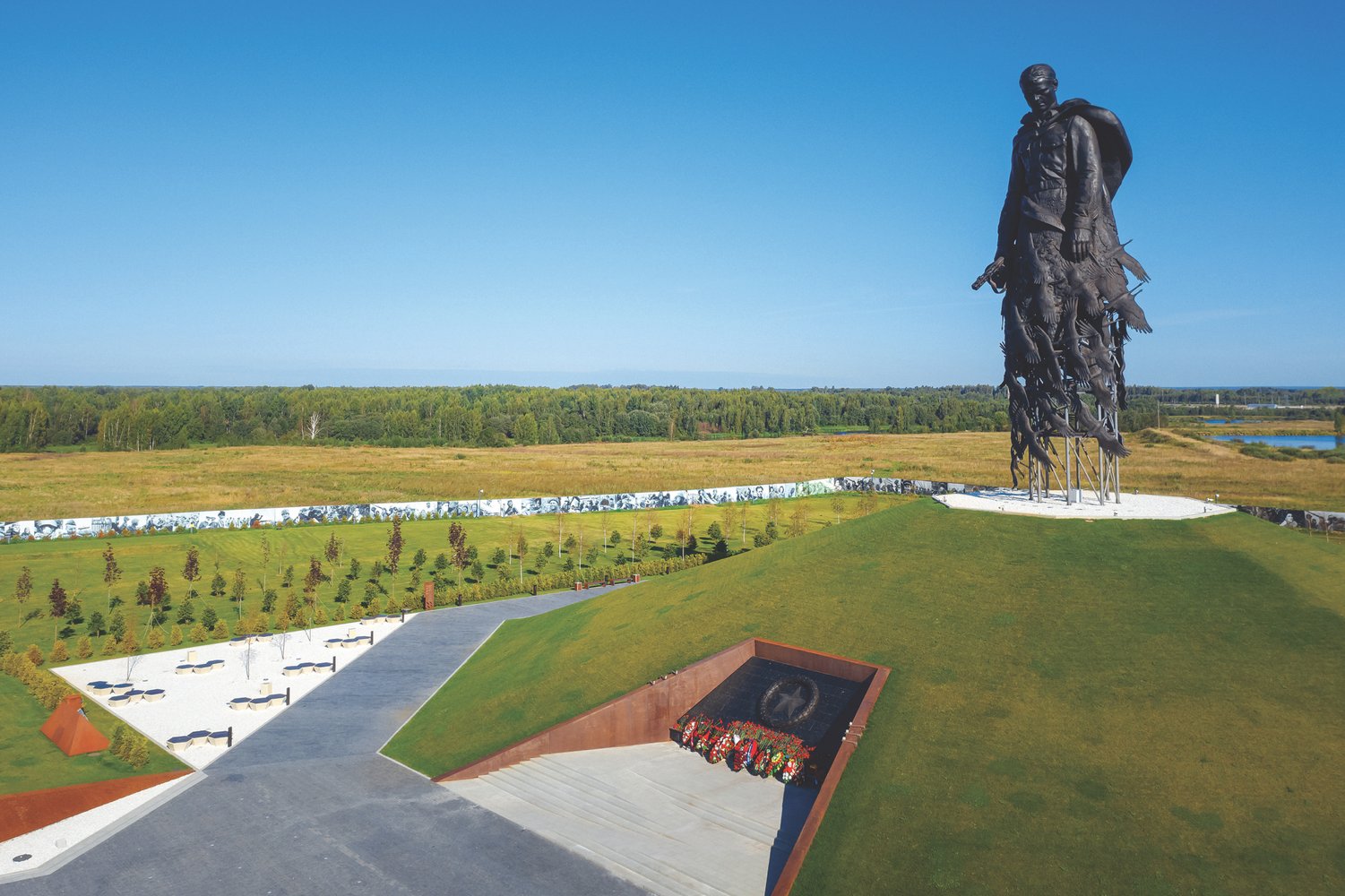 Мемориальный комплекс (на фото выше), возведённый пять лет назад на месте одной из самых кровопролитных битв Великой Отечественной, расположен вблизи деревни Хорошево. Стержень его композиции – 25-метровая статуя воина, будто парящая над курганом. Окутывающая солдата плащ-палатка в своей нижней части становится стаей журавлей – это отсылка к знаменитому стихотворению Расула Гамзатова. На плитах, стоящих по краям ведущей к статуе Аллеи Памяти, увековечены имена 62 000 погибших в Ржевской битве.