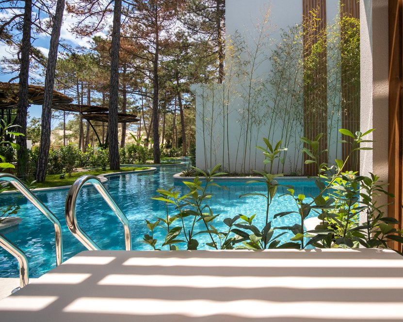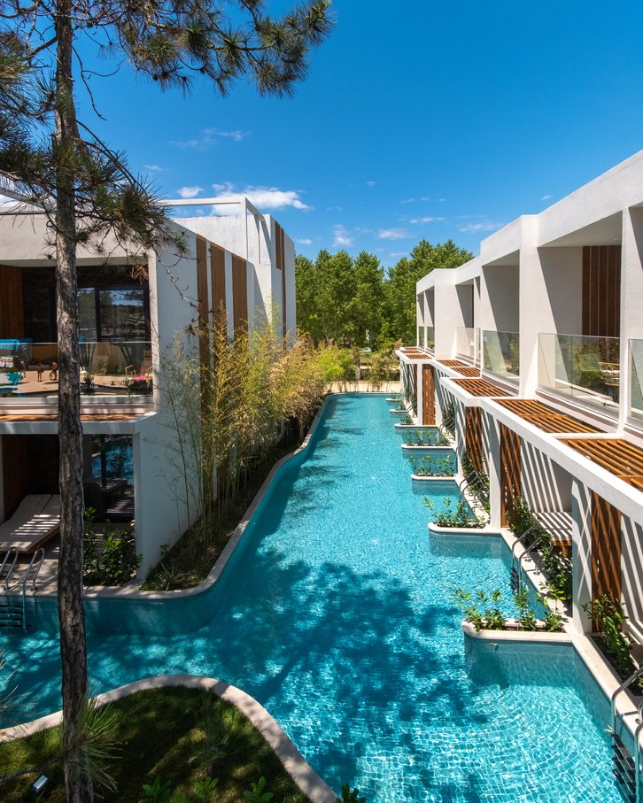 Здесь гости размещаются не в общем корпусе, а в современных комфортабельных виллах, оснащённых всем необходимым. Уютные спальные зоны, бытовая техника и продуманный дизайн создают ощущение дома, в который приятно возвращаться после насыщенного дня. Коттеджи расположены вокруг трёх бассейнов, два из которых имеют удобную детскую чашу. Номера категорий LUXE и SUPERIOR предлагают собственный выход прямо к бассейну. В общем, идеальный набор для классного утра: выпить утренний кофе на террасе и следом – нырнуть в прохладную воду без необходимости куда-то идти.