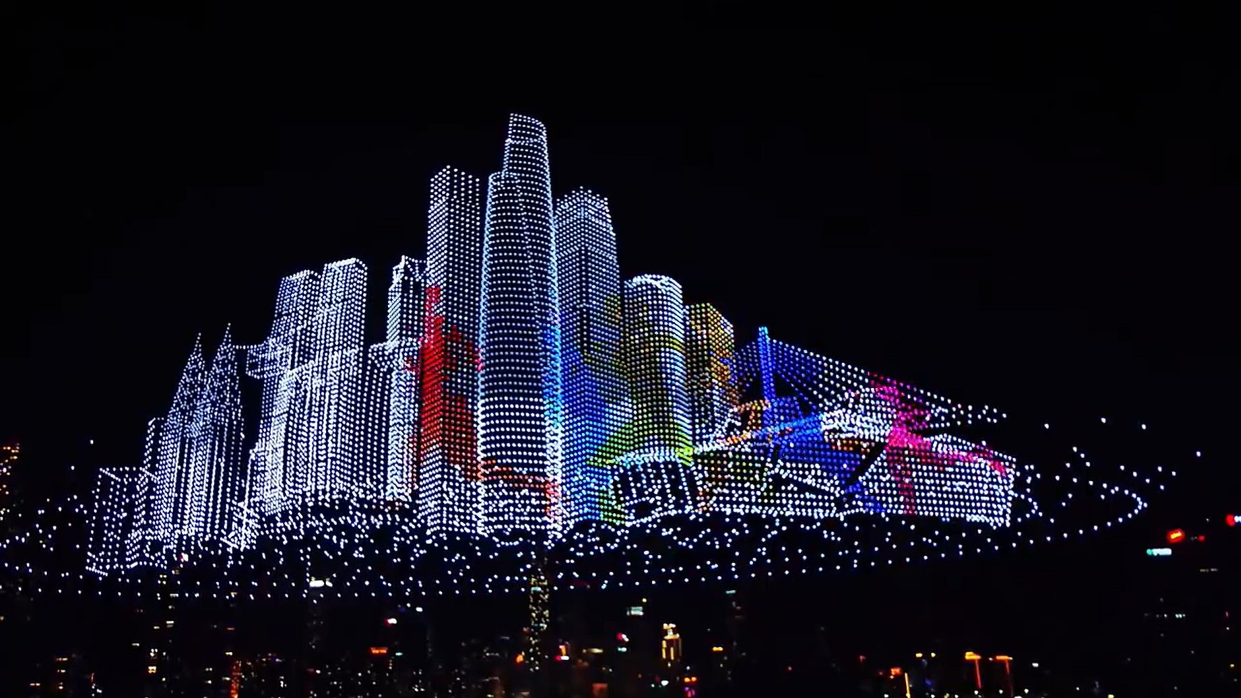 Во время представления, которое посетило более 100,000 человек, зрители могли наблюдать за формированием в небе гигантских узоров – местных талисманов, цветов и надписей. Стая дельфинов плыла по небу и «ныряла» в воду, в воздухе протянуло корни гигантское дерево, а в один момент над набережной «повис» целый небесный город из дронов!