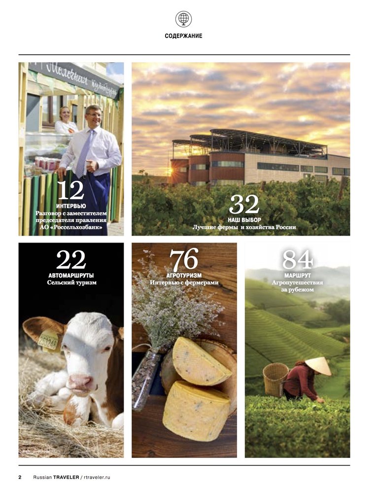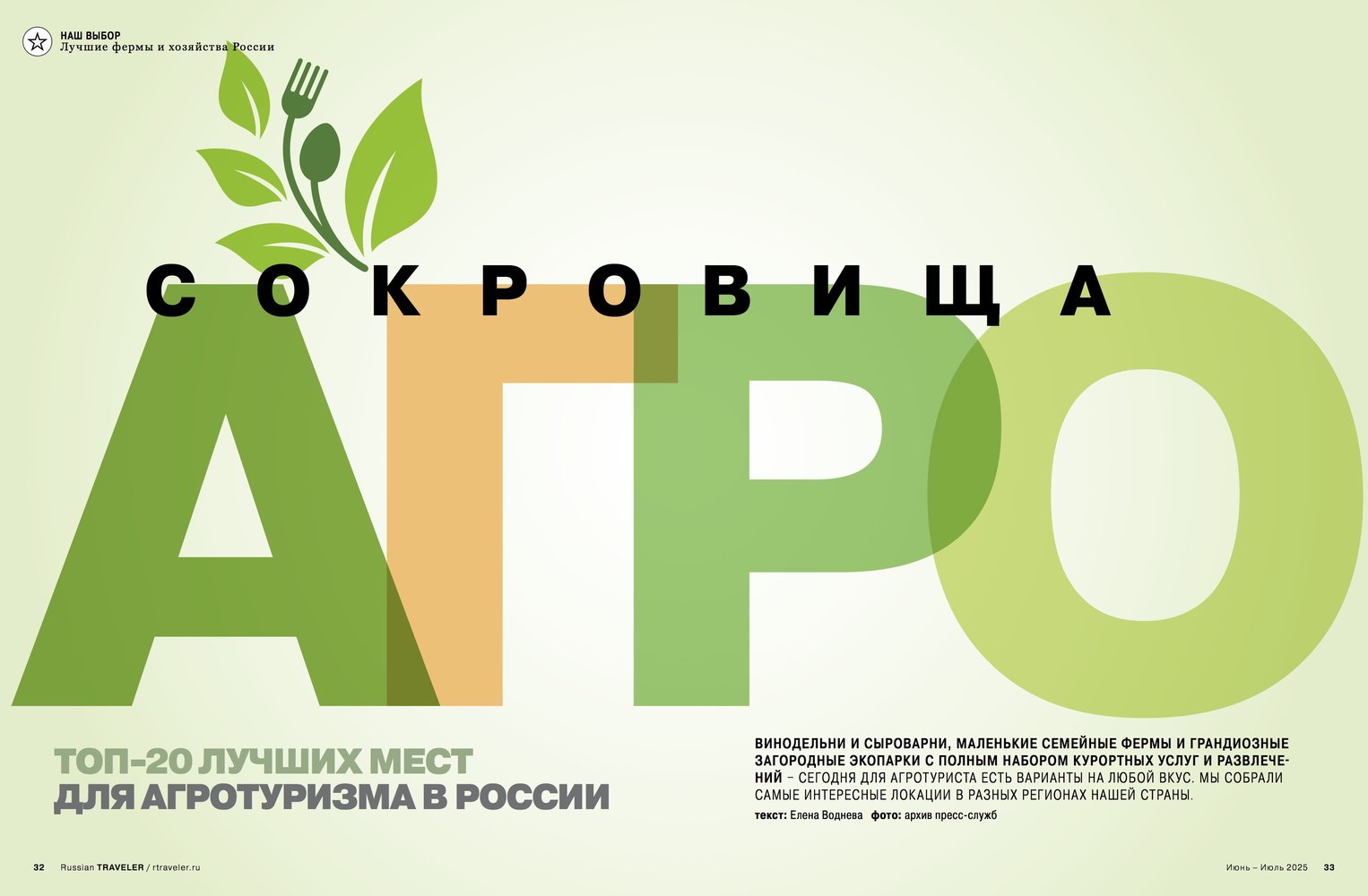 Молочные заводы и сыроварни, биохутора и агрокластеры, винодельни и сидрерии, фермы альпак и страусов, мараловодческие хозяйства и колодные пасеки – в первом тематическом номере Russian Traveler, целиком посвящённом агротуризму, мы выбрали 20 объектов по всей России, где ждут и умеют принимать, угощать и развлекать любопытных путешественников.
