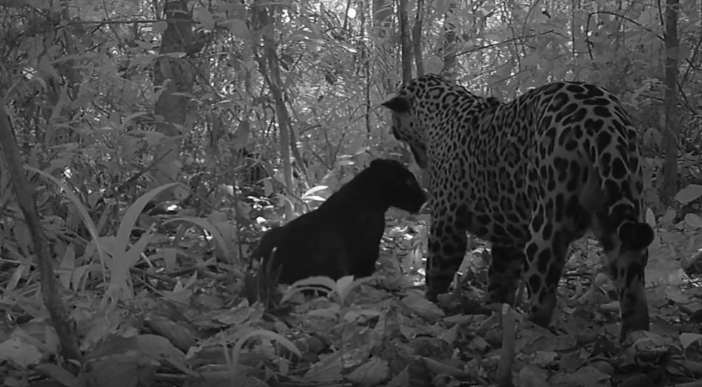 Ученые ликуют: после длительной подготовки на фотоловушку в дикой природе попало видео спаривания чёрной самки ягуара (Panthera onca) и её пятнистого партнёра.