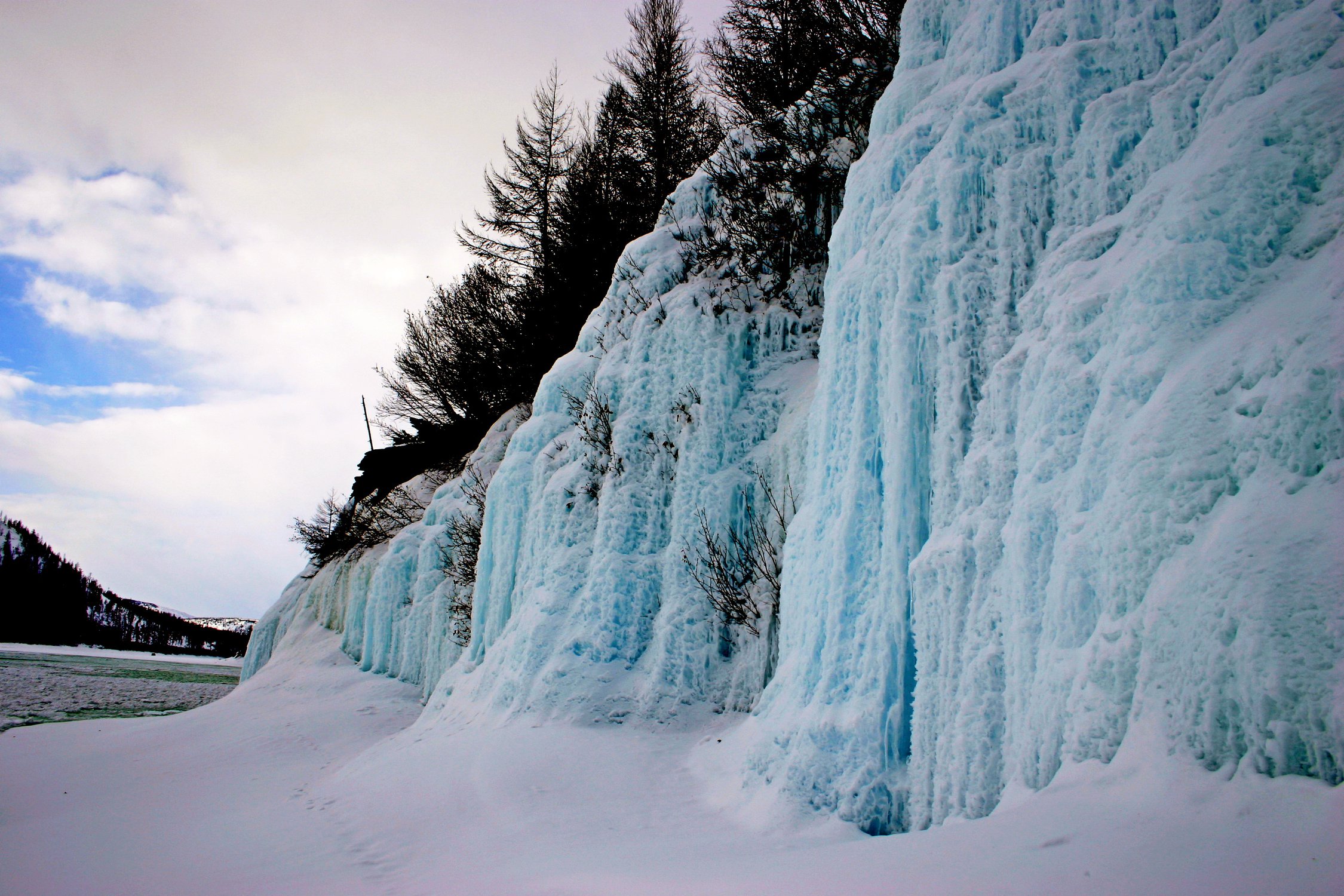 Раняя весна на Колыме. Голубой натечный лед образует настоящий ледопад. Река Бахапча, приток р.Колымы, Магаданская обл.