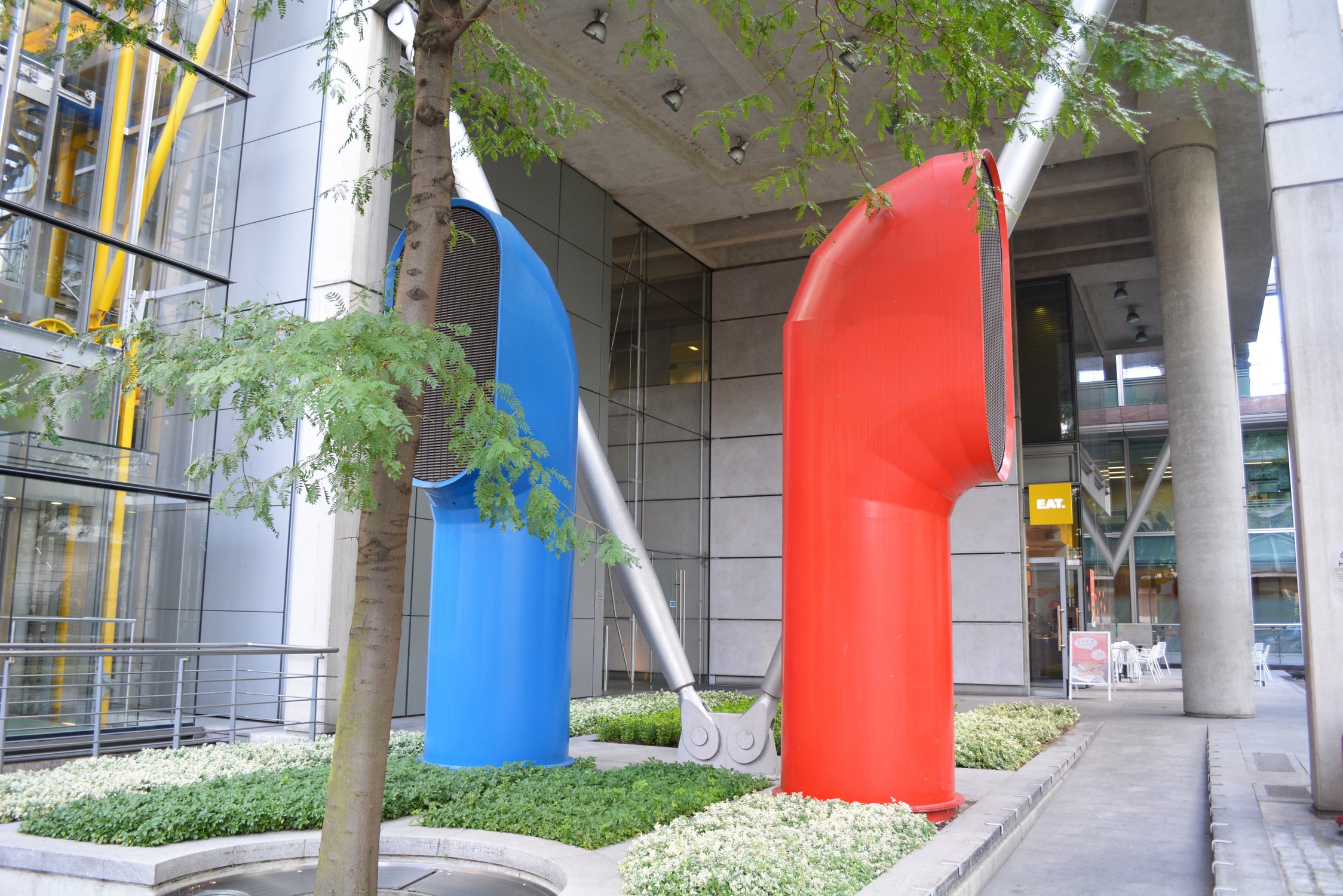 Редкие краски в Лондонском Сити - цветные трубы на фоне ч/б зданий, сентябрь 2013г.