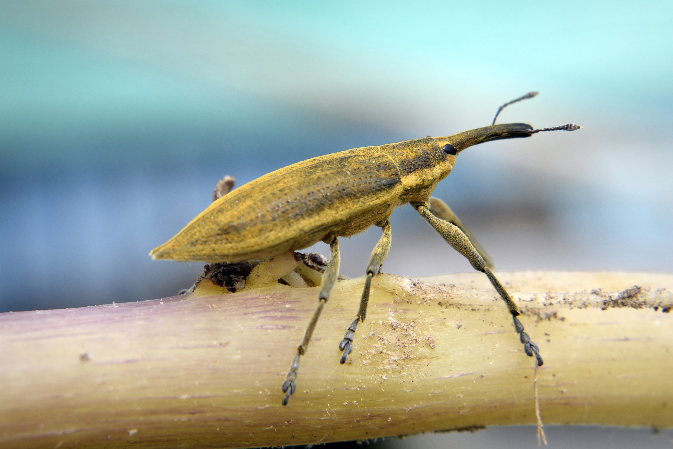 На картофельной ботве задержался жук-долгоносик, будто хочет проверить - нет ли опасности на его пути.